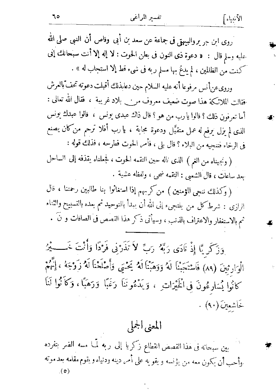 روى ابن جرير والبيهقي فى جماعة عن سعد بن أبى وقاص أن النبي صلّى الله عليه وسلّم قال: «دعوة ذى النون فى بطن الحوت: لا إله إلا أنت سبحانك إنى كنت من الظالمين، لم يدع بها مسلم ربه فى شىء قط إلا استجاب له» .