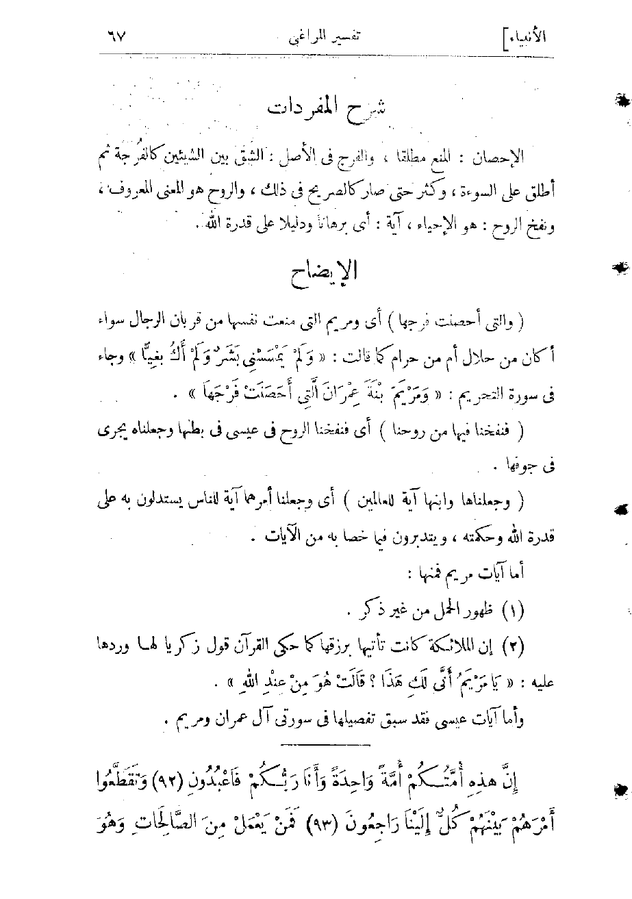 الإحصان: المنع مطلقا، والفرج فى الأصل: الشق بين الشيئين كالفرجة، ثم أطلق على السّوءة، وكثر حتى صار كالصريح فى ذلك، والروح هو المعنى المعروف، ونفخ الروح: هو الإحياء، آية: أي برهانا ودليلا على قدرة الله.