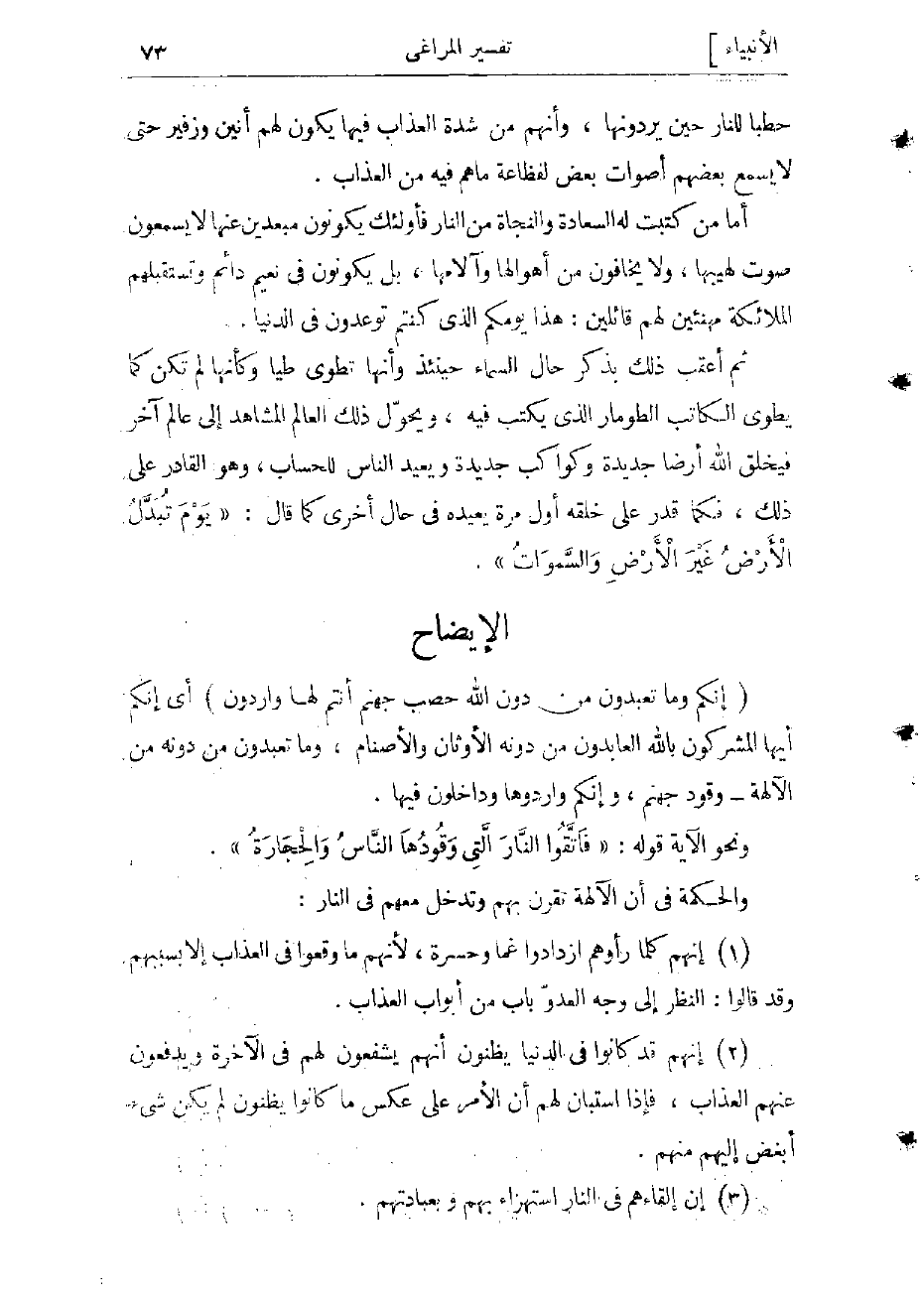 ثم أعقب ذلك بذكر حال السماء حينئذ، وأنها تطوى طيا وكأنها لم تكن كما يطوى الكاتب الطومار الذي يكتب فيه، ويحوّل ذلك العالم المشاهد إلى عالم آخر فيخلق الله أرضا جديدة وكواكب جديدة ويعيد الناس للحساب، وهو القادر على ذلك، فكما قدر على خلقه أول مرة يعيده فى حال أخرى كما قال: «يَوْمَ تُبَدَّلُ الْأَرْضُ غَيْرَ الْأَرْضِ وَالسَّماواتُ» .