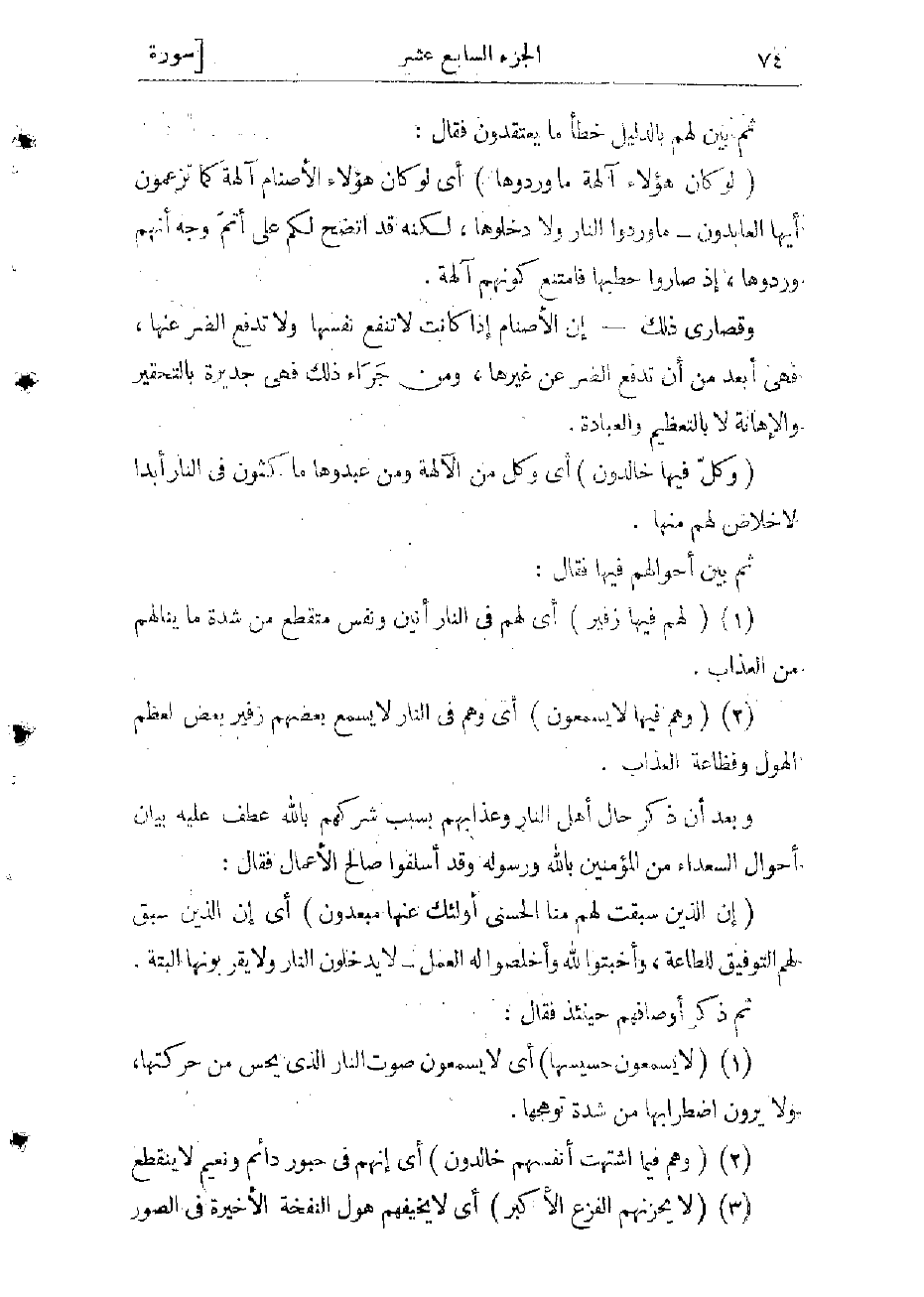 (2) (وَهُمْ فِيها لا يَسْمَعُونَ) أي وهم فى النار لا يسمع بعضهم زفير بعض، لعظم الهول وفظاعة العذاب.