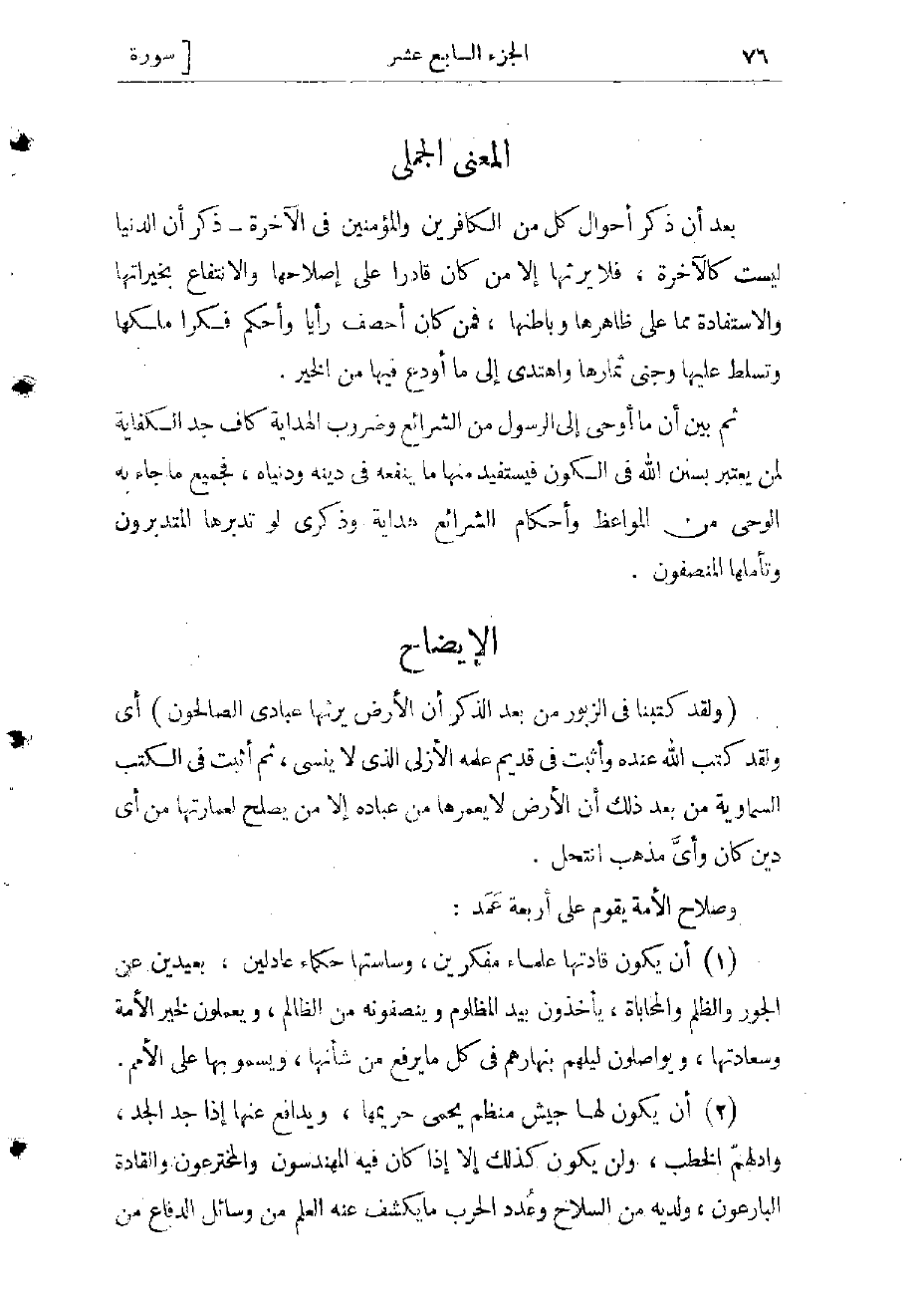 (1) أن يكون قادتها علماء مفكرين، وساستها حكماء عادلين، بعيدين عن الجور والظلم والمحاباة، يأخذون بيد المظلوم وينصفونه من الظالم، ويعملون لخير الأمة وسعادتها، ويواصلون ليلهم بنهارهم فى كل ما يرفع من شأنها، ويسمو بها على الأمم.