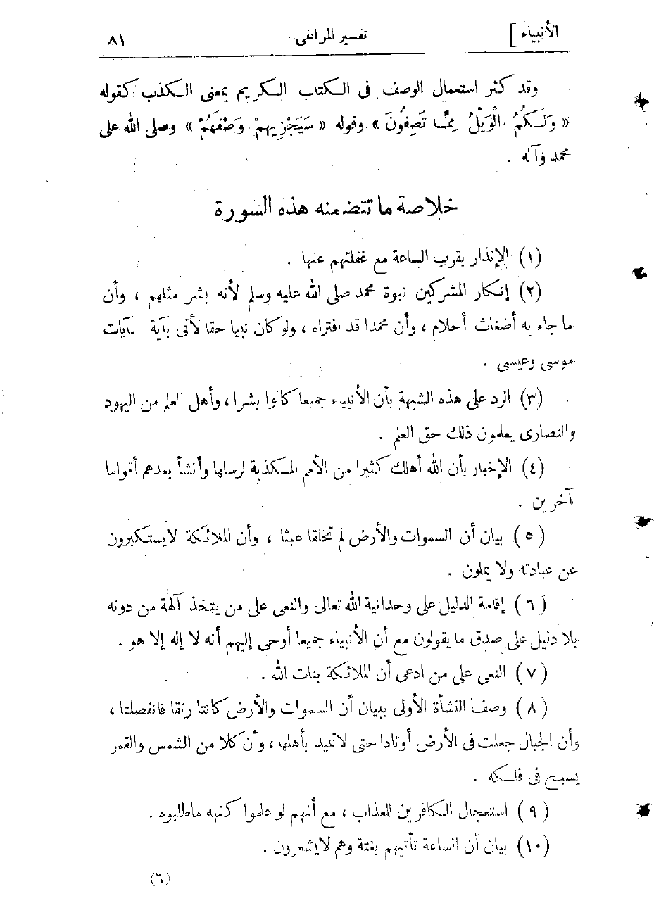 (8) وصف النشأة الأولى ببيان أن السموات والأرض كانتا رتقا فانفصلتا، وأن الجبال جعلت فى الأرض أوتادا حتى لا تميد بأهلها، وأن كلا من الشمس والقمر يسبح فى فلكه.