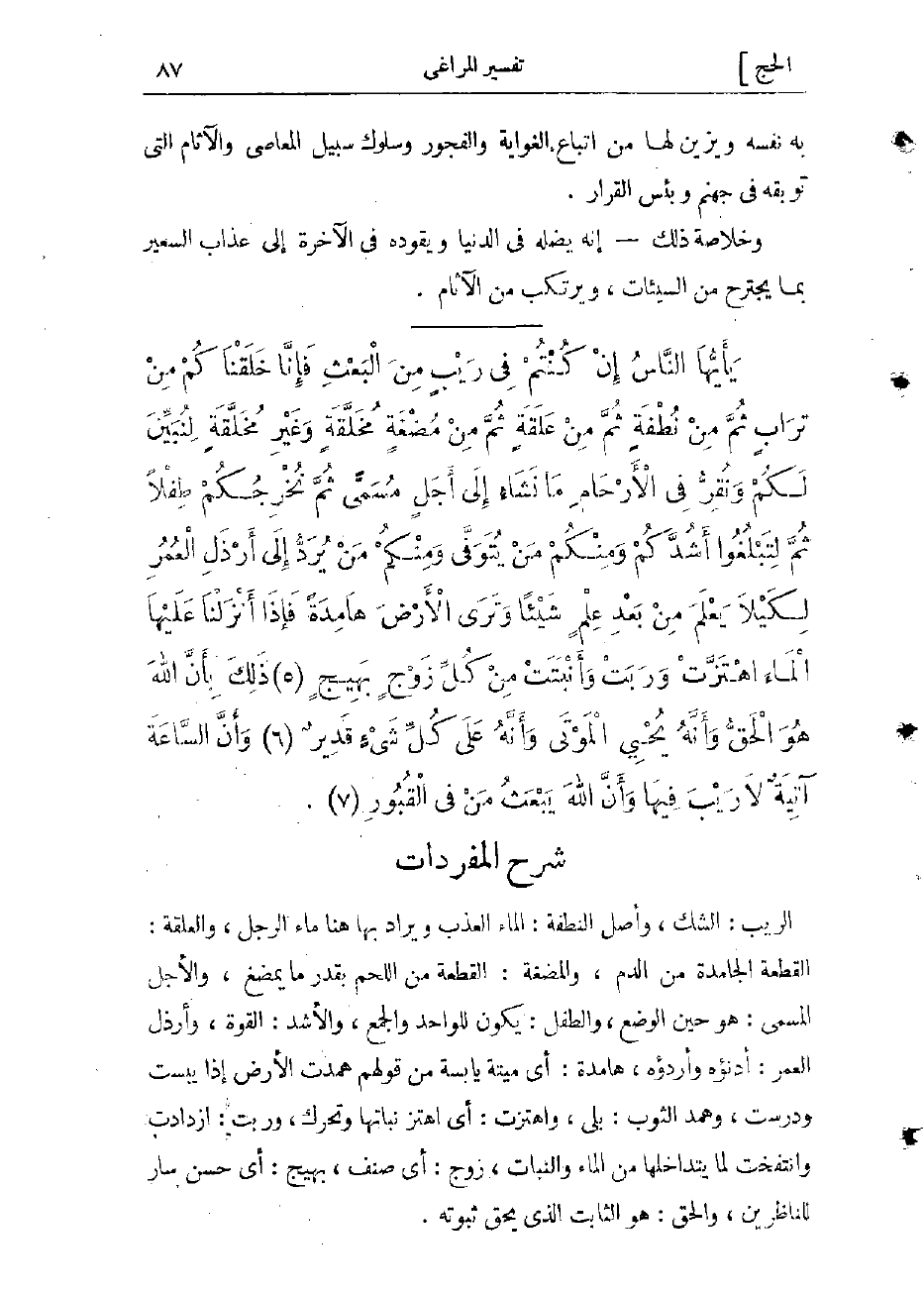أدنؤه وأردؤه، هامدة: أي ميتة يابسة من قولهم همدت الأرض إذا يبست ودرست، وهمد الثوب: بلى، واهتزت: أي اهتز نباتها وتحرك، وربت: ازدادت وانتفخت لما يتداخلها من الماء والنبات، زوج: أي صنف، بهيج: أي حسن سارّ للناظرين، والحق: هو الثابت الذي يحق ثبوته.