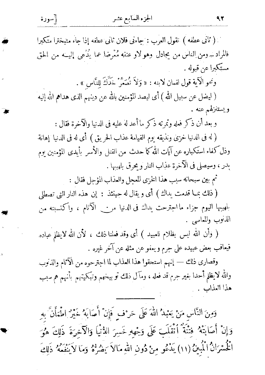 (لَهُ فِي الدُّنْيا خِزْيٌ وَنُذِيقُهُ يَوْمَ الْقِيامَةِ عَذابَ الْحَرِيقِ) أي له فى الدنيا إهانة وذل كفاء استكباره عن آيات الله كما حدث من القتل والأسر بأيدى المؤمنين يوم بدر، وسيصلى فى الآخرة عذاب النار ويحرق بلهبها.