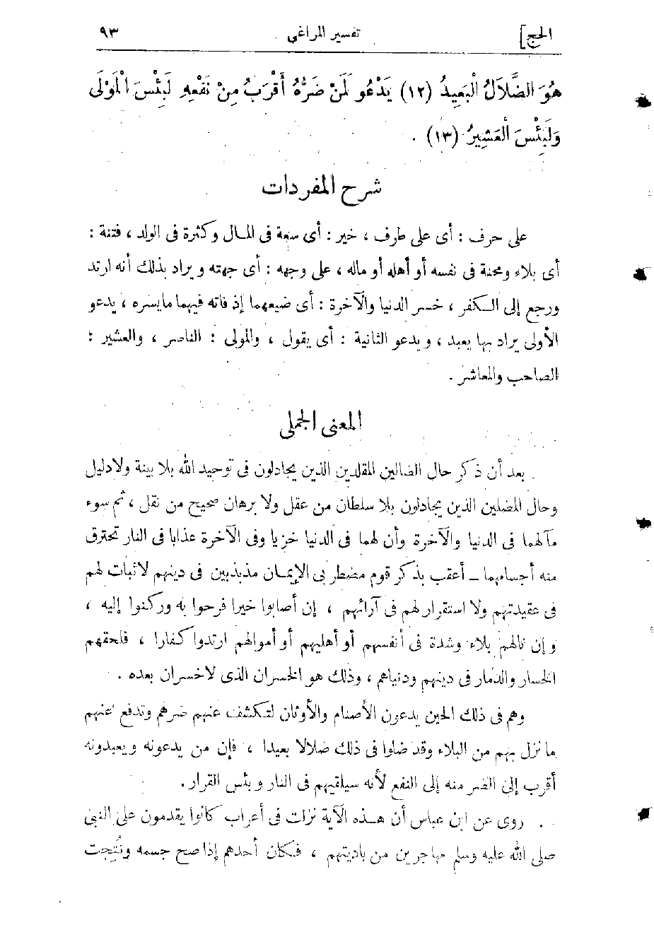 على حرف: أي على طرف، خير: أي سعة فى المال وكثرة فى الولد، فتنة: أي بلاء ومحنة فى نفسه أو أهله أو ماله، على وجهه: أي جهته ويراد بذلك أنه ارتد ورجع إلى الكفر، خسر الدنيا والآخرة: أي ضيّعهما، إذ فاته فيهما ما يسره، يدعو الأولى يراد بها يعبدو يدعو الثانية يراد بها يقول- والمولى: الناصر، والعشير: الصاحب والمعاشر