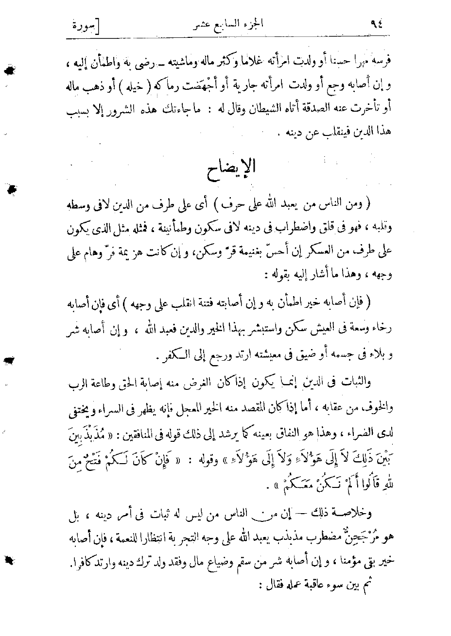 وخلاصة ذلك- أن من الناس من ليس له ثبات فى أمر دينه، بل هو مرجحنّ مضطرب مذبذب، يعبد الله على وجه التجربة انتظارا للنعمة، فإن أصابه خير بقي مؤمنا، وإن أصابه شر من سقم أو ضياع مال أو فقد ولد ترك دينه وارتد كافرا.