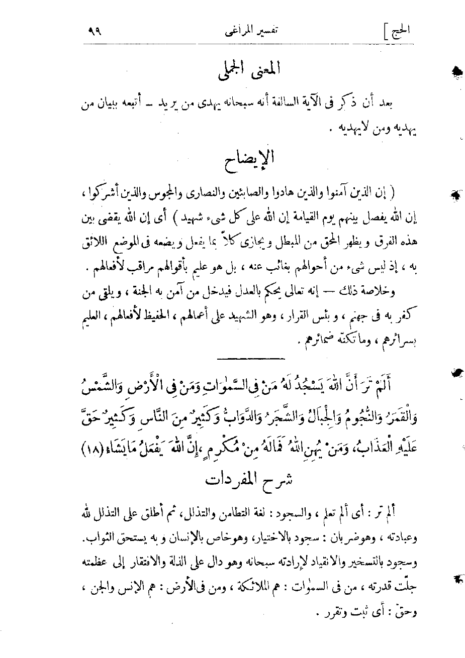 (إِنَّ الَّذِينَ آمَنُوا وَالَّذِينَ هادُوا وَالصَّابِئِينَ وَالنَّصارى وَالْمَجُوسَ وَالَّذِينَ أَشْرَكُوا، إِنَّ اللَّهَ يَفْصِلُ بَيْنَهُمْ يَوْمَ الْقِيامَةِ إِنَّ اللَّهَ عَلى كُلِّ شَيْءٍ شَهِيدٌ) أي إن الله يقضى بين هذه الفرق، ويجازى كلّا بما يفعل، ويضعه فى الموضع اللائق به، إذ ليس شىء من أحوالهم بغائب عنه، بل هو عليم بأقوالهم مراقب لأفعالهم.