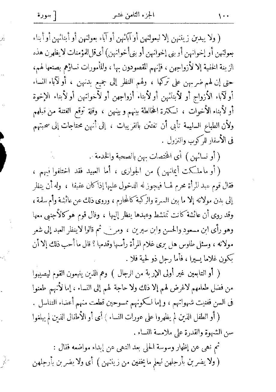 (وَلا يُبْدِينَ زِينَتَهُنَّ إِلَّا لِبُعُولَتِهِنَّ أَوْ آبائِهِنَّ أَوْ آباءِ بُعُولَتِهِنَّ أَوْ أَبْنائِهِنَّ أَوْ أَبْناءِ بُعُولَتِهِنَّ أَوْ إِخْوانِهِنَّ أَوْ بَنِي إِخْوانِهِنَّ أَوْ بَنِي أَخَواتِهِنَّ) أي قل للمؤمنات لا يظهرن هذه الزينة الخفيّة إلا لأزواجهن، فإنهم المقصودون بها والمأمورات نساؤهم بصنعها لهم، حتى إن لهم ضربهن على تركها، ولهم النظر إلى جميع بدنهن، أو لآباء النساء أو لآباء الأزواج أو لأبنائهن أو لأبناء أزواجهن أو لاخواتهن أو لأبناء الإخوة أو لأبناء الأخوات، لكثرة المخالطة بينهم وبينهن، وقلة توقع الفتنة من قبلهم ولأن الطباع السليمة تأبى أن تفتتن بالقريبات، إلى أنهن محتاجات إلى صحبتهم فى الأسفار للركوب والنزول.