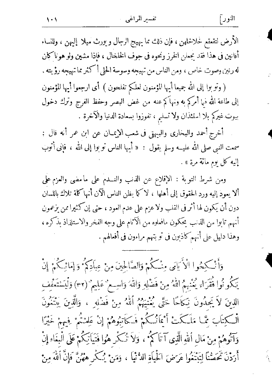 الأرض لتقعقع خلاخلهن، فإن ذلك مما يهيج الرجال ويورث ميلا إليهن، وللنساء أفانين فى هذا، فقد يجعلن الخرز ونحوه فى جوف الخلخال، فإذا مشين ولو هونا كان له رنين وصوت خاص، ومن الناس من تهيجه وسوسة الحلي أكثر مما تهيجه رؤيته (وَتُوبُوا إِلَى اللَّهِ جَمِيعاً أَيُّهَا الْمُؤْمِنُونَ لَعَلَّكُمْ تُفْلِحُونَ) أي ارجعوا أيها المؤمنون إلى طاعة الله فيما أمركم به ونهاكم عنه من غض البصر وحفظ الفرج وترك دخول بيوت غيركم بلا استئذان ولا تسليم، تفوزوا بسعادة الدنيا والآخرة.