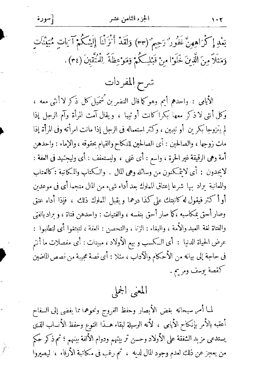 الأيامى: واحدهم أيم وهو كما قال النضر بن شميل كل ذكر لا أنثى معه، وكل أنثى لا ذكر معها بكرا كانت أو ثيبا، ويقال آمت المرأة وآم الرجل إذا لم يتزوجا بكرين أو ثيبين، وكثر استعماله فى الرجل إذا ماتت امرأته وفى المرأة إذا مات زوجها، والصالحين: أي الصالحين للنكاح والقيام بحقوقه، والإماء: واحدهن أمة وهى الرقيقة غير الحرة، واسع: أي غنىّ، وليستعفف: أي وليجتهد فى العفة، لا يجدون: أي لا يتمكّنون من وسائله وهى المال والكتاب والمكاتبة: كالعتاب والمعاتبة يراد بها شرعا إعتاق المملوك بعد أداء شىء من المال منجّما أي فى موعدين أو أكثر فيقول له كاتبتك على كذا درهما ويقبل المملوك ذلك، فإذا أدّاه عتق وصار أحق بمكاسبه، كما صار أحق بنفسه، والفتيات: واحدهن فتاة، ويراد بالفتى والفتاة لغة العبد والأمة، والبغاء: الزنا والتحصن: العفة، لتبتغوا: أي لتطلبوا، عرض الحياة الدنيا: أي الكسب وبيع الأولاد، مبينات: أي مفصّلات ما أنتم فى حاجة إلى بيانه من الأحكام والآداب، مثلا: أي فصة عجيبة من قصص الماضين كقصة يوسف ومريم.
