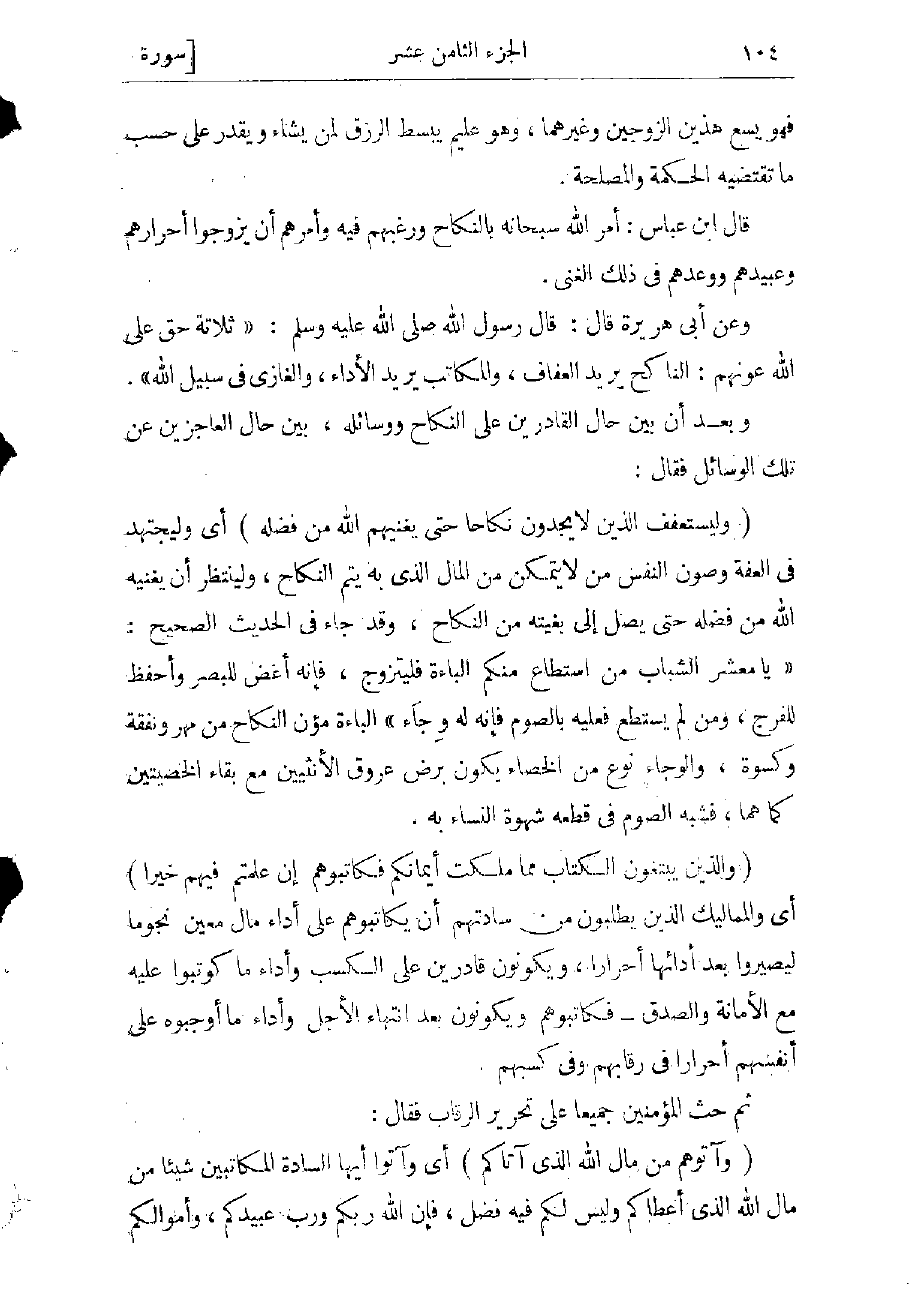 قال ابن عباس: أمر الله سبحانه بالنكاح، ورغّبهم فيه، وأمرهم أن يزوجوا أحرارهم وعبيدهم ووعدهم فى ذلك الغنى.