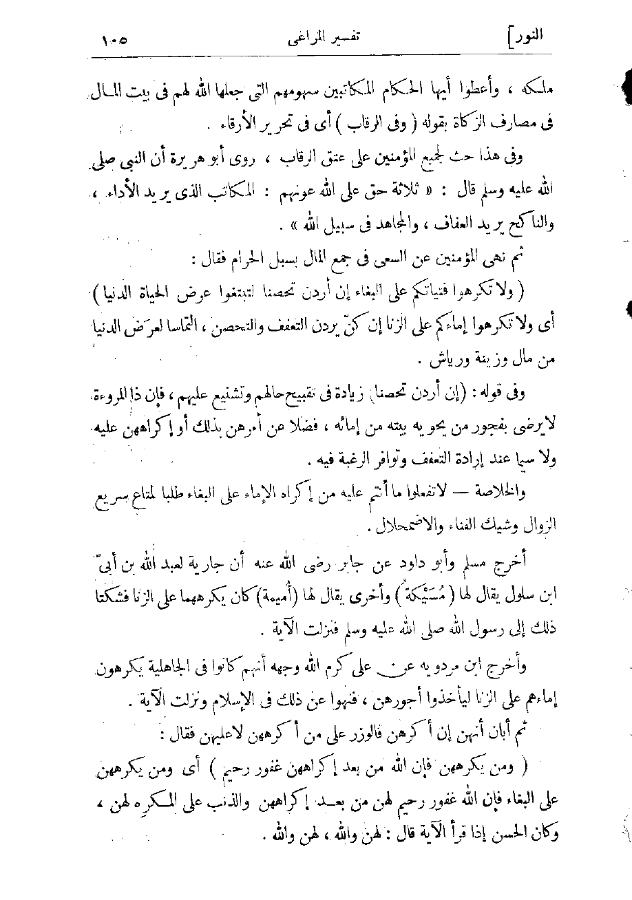 أخرج مسلم وأبو داود عن جابر رضى الله عنه أن جارية لعبد الله بن أبىّ ابن سلول يقال لها (مسيكة) وأخرى يقال لها (أميمة) كان يكرههما على الزنا فشكتا ذلك إلى رسول الله صلّى الله عليه وسلّم فنزلت الآية.
