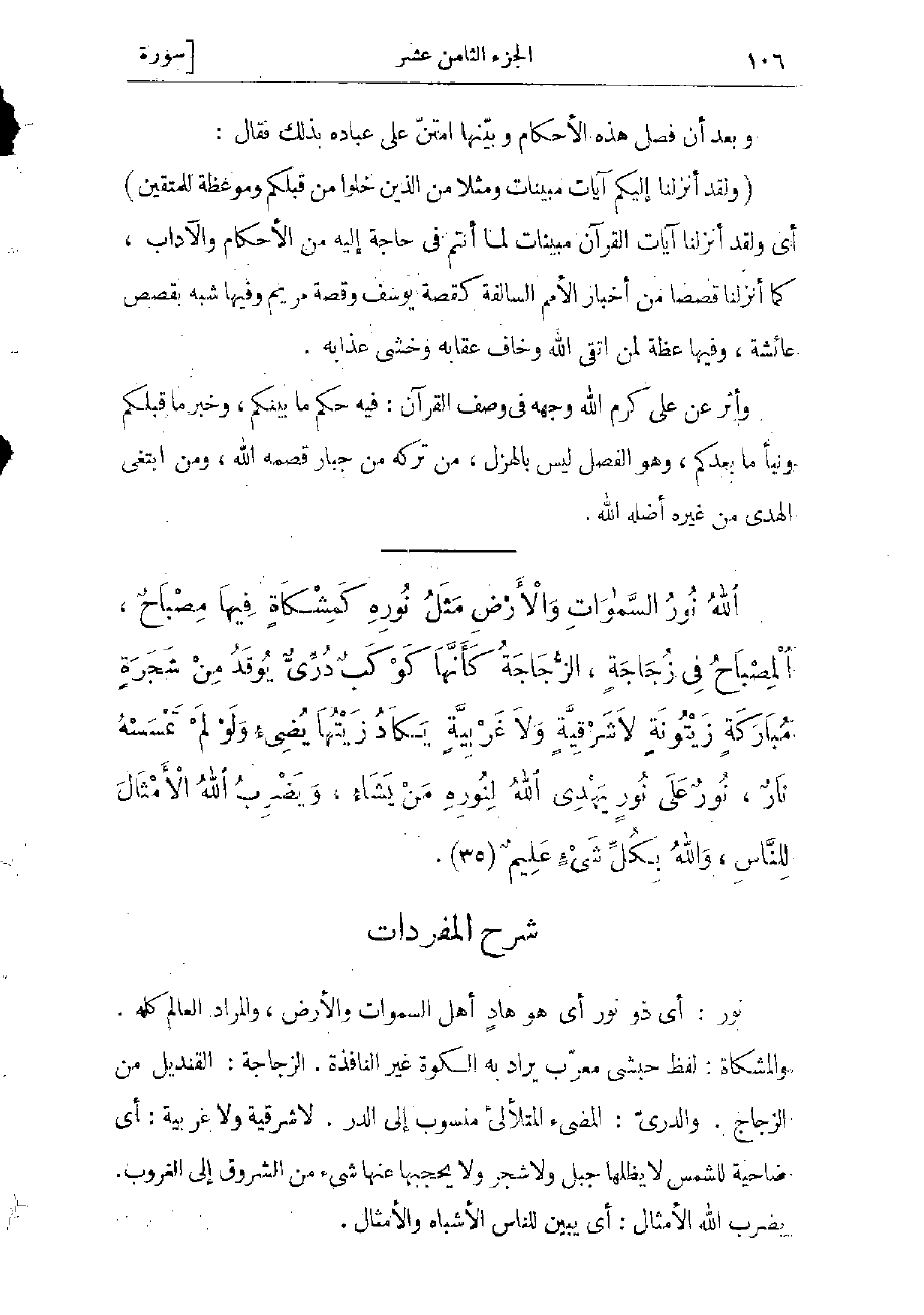 نور: أي ذو نور أي هو هاد أهل السموات والأرض، والمراد العالم كله، والمشكاة: لفظ حبشى معرّب يراد به الكوّة غير النافذة، الزجاجة: القنديل من الزجاج، والدرىّ: المضيء المتلألئ منسوب إلى الدر، لا شرقية ولا غربية: أي ضاحية للشمس لا يظلها جبل ولا شجر ولا يحجبها عنها شىء من الشروق إلى الغروب، يضرب الله الأمثال: أي يبين للناس الأشباه والأمثال.
