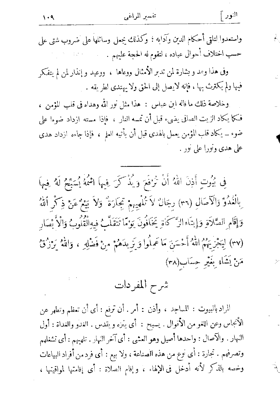 المراد بالبيوت: المساجد، وأذن: أمر، أن ترفع: أي أن تعظم وتطهّر عن الأنجاس وعن اللغو من الأقوال، يسبح: أي ينزّه ويقدّس، الغدو والغداة: أول النهار، والآصال: واحدها أصيل وهو العشى: أي آخر النهار، تلهيهم: أي تشغلهم وتصرفهم، تجارة: أي نوع من هذه الصناعة، ولا بيع: أي فرد من أفراد البياعات وخصه بالذكر لأنه أدخل فى الإلهاء، وإقام الصلاة: أي إقامتها لمواقيتها، وإيتاء الزكاة: