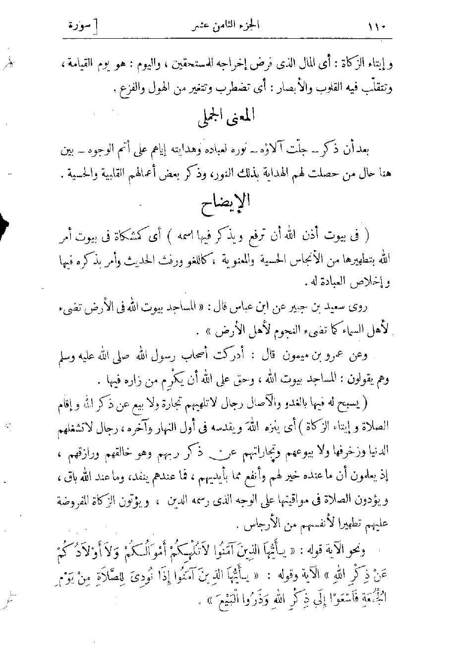 (يُسَبِّحُ لَهُ فِيها بِالْغُدُوِّ وَالْآصالِ رِجالٌ لا تُلْهِيهِمْ تِجارَةٌ وَلا بَيْعٌ عَنْ ذِكْرِ اللَّهِ وَإِقامِ الصَّلاةِ وَإِيتاءِ الزَّكاةِ) أي ينزه الله ويقدسه فى أول النهار وآخره، رجال لا تشغلهم الدنيا وزخرفها ولا بيوعهم وتجاراتهم عن ذكر ربهم وهو خالقهم ورازقهم، إذ يعلمون أن ما عنده خير لهم وأنفع مما بأيديهم، فما عندهم ينفد، وما عند الله باق، ويؤدون الصلاة فى مواقيتها على الوجه الذي رسمه الدين، ويؤتون الزكاة المفروضة عليهم تطهيرا لأنفسهم من الأرجاس.
