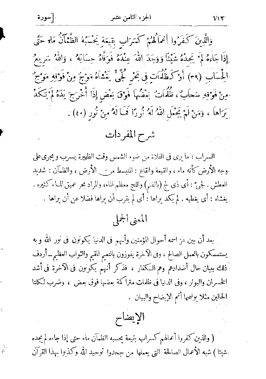 السراب: ما يرى فى الفلاة من ضوء الشمس وقت الظهيرة يسرب ويحرى على وجه الأرض كأنه ماء، والقيعة والقاع: المنبسط من الأرض، والظمآن: شديد العطش، لجى: أي ذى لج (بالضم) واللجّ معظم الماء، والمراد بحر عميق الماء كثيره، يغشاه:
