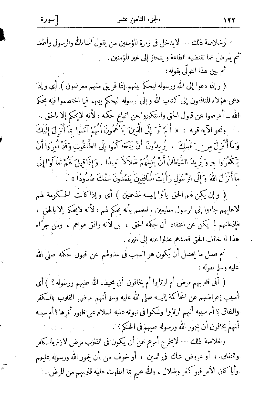 (وَإِذا دُعُوا إِلَى اللَّهِ وَرَسُولِهِ لِيَحْكُمَ بَيْنَهُمْ إِذا فَرِيقٌ مِنْهُمْ مُعْرِضُونَ) أي وإذا دعى هؤلاء المنافقون إلى كتاب الله وإلى رسوله ليحكم بينهم فيما اختصموا فيه بحكم الله- أعرضوا عن قبول الحق واستكبروا عن اتباع حكمه، لأنه لا يحكم إلا بالحق.