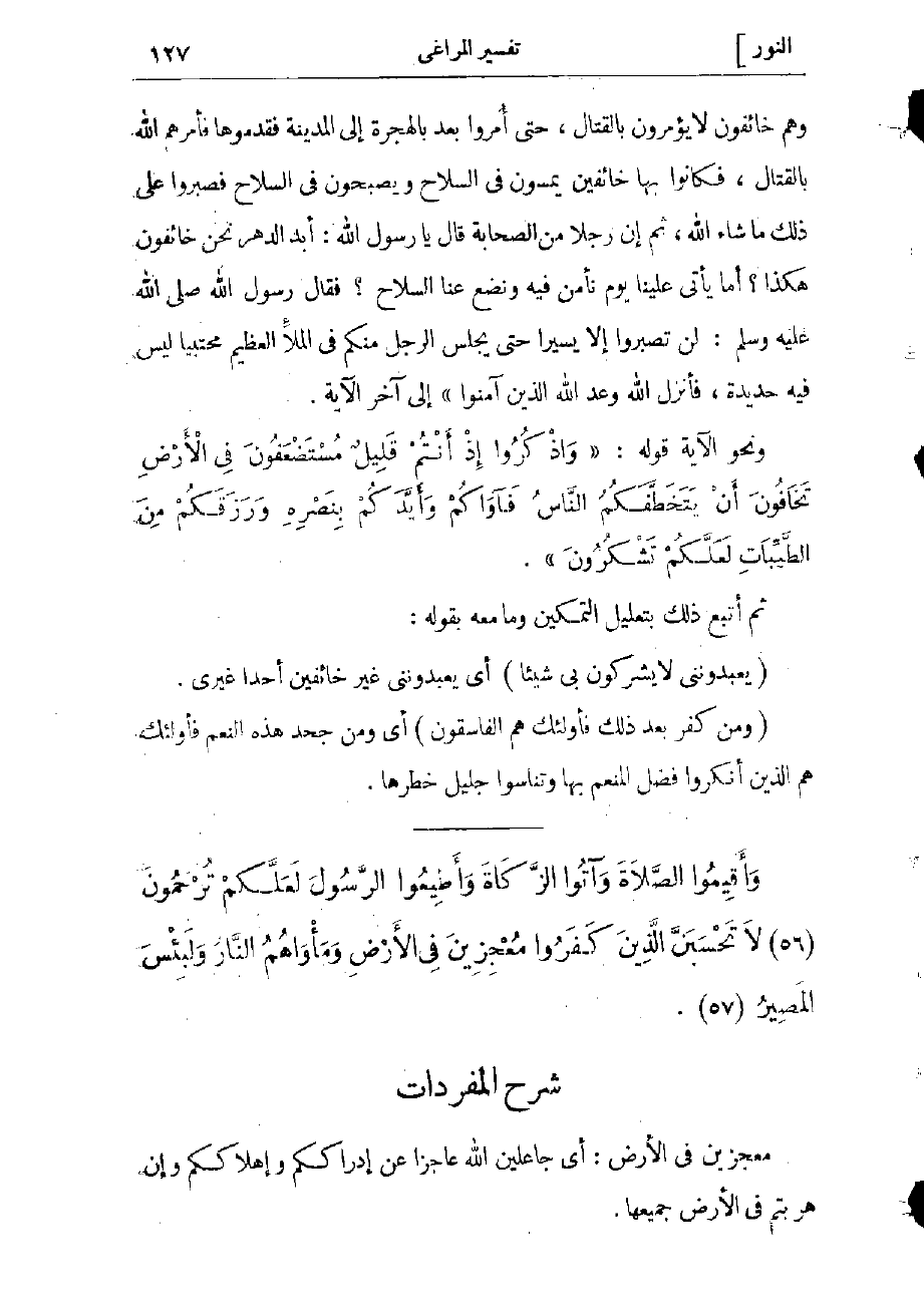 حتى أمروا بعد بالهجرة إلى المدينة فقدموها، فأمرهم الله بالقتال، فكانوا بها خائفين، يمسون فى السلاح ويصبحون فى السلاح، فصبروا على ذلك ما شاء الله، ثم إن رجلا من الصحابة قال يا رسول الله: أبد الدهر نحن خائفون هكذا؟ أما يأتى علينا يوم نأمن فيه ونضع عنا السلاح؟ فقال رسول الله صلّى الله عليه وسلم: لن تصبروا إلا يسيرا حتى يجلس الرجل منكم فى الملأ العظيم محتبيا ليس فيه حديدة، فأنزل الله «وَعَدَ اللَّهُ الَّذِينَ آمَنُوا»