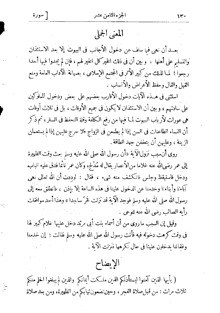 استثنى فى هذه الآيات دخول الأقارب بعضهم على بعض، ودخول المملوكين على سادتهم، وبين أن الاستئذان لا يكون فى جميع الأوقات، بل فى ثلاث أوقات هى عورات لأرباب البيوت، لما فيها من رفع الكلفة وقلة التحفظ فى الستر، ثم ذكر أن النساء الطاعنات فى السن إذا لم يطمعن فى الزواج فلا حرج عليهن إذا لم يستعملن الزينة، وعليهن أن يتعففن جهد الطاقة.