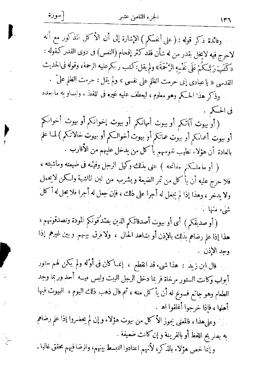 قال ابن زيد: هذا شىء قد انقطع، إنما كان فى أوّله ولم يكن لهم ستور أبواب، أو كانت الستور مرخاة فربما دخل الرجل البيت وليس فيه أحد، وربما وجد الطعام وهو جائع، فسوّغ له أن يأكل منه، ثم قال ذهب ذلك اليوم، البيوت فيها أهلها، فإذا خرجوا أغلقوا اه.