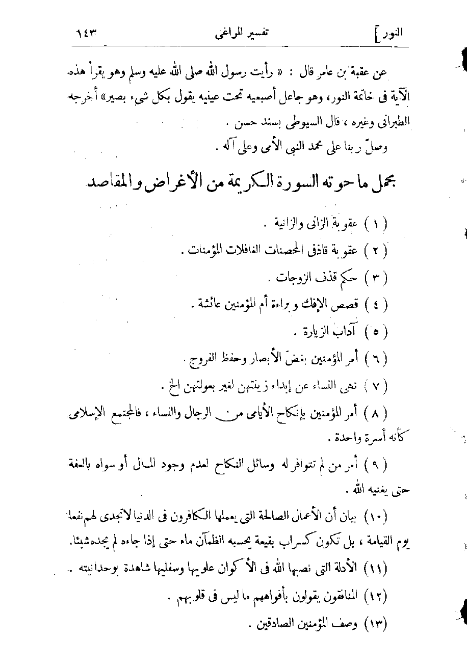عن عقبة بن عامر قال: «رأيت رسول الله صلّى الله عليه وسلّم وهو يقرأ هذه الآية فى خاتمة النور، وهو جاعل أصبعيه تحت عينيه يقول بكل شىء بصير» أخرجه الطبراني وغيره، قال السيوطي بسند حسن.