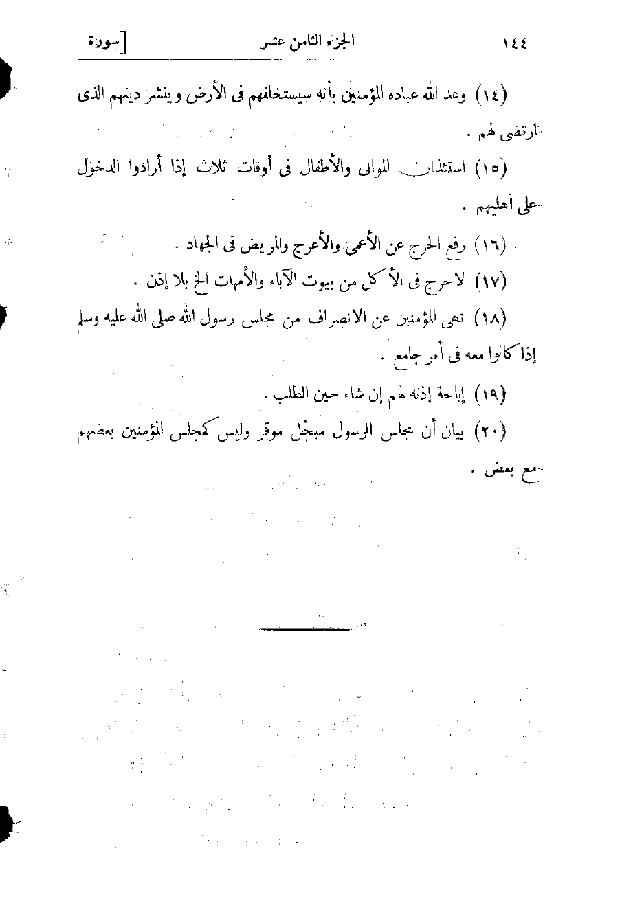 (15) استئذان الموالي والأطفال فى أوقات ثلاث إذا أرادوا الدخول على أهليهم (16) رفع الحرج عن الأعمى والأعرج والمريض فى الجهاد.