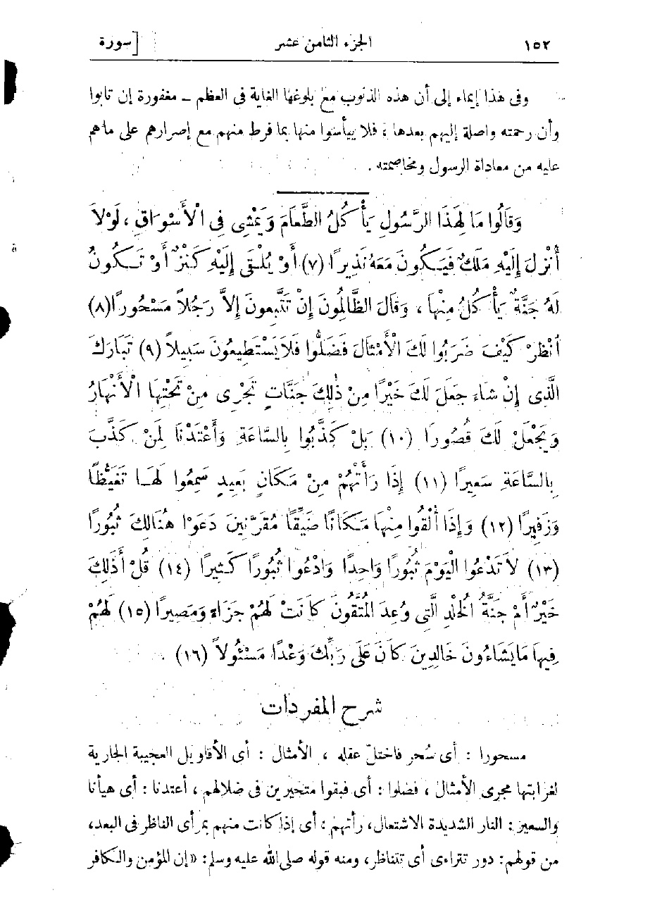 مسحورا: أي سحر فاختلّ عقله، الأمثال: أي الأقاويل العجيبة الجارية لغرابتها مجرى الأمثال، فضلوا: أي فبقوا متحيرين فى ضلالهم، أعتدنا: أي هيأنا والسعير: النار الشديدة الاشتعال، رأتهم: أي إذا كانت منهم بمرأى الناظر فى البعد، من قولهم: دور تتراءى أي تتناظر، ومنه قوله صلّى الله عليه وسلم: «إن المؤمن والكافر