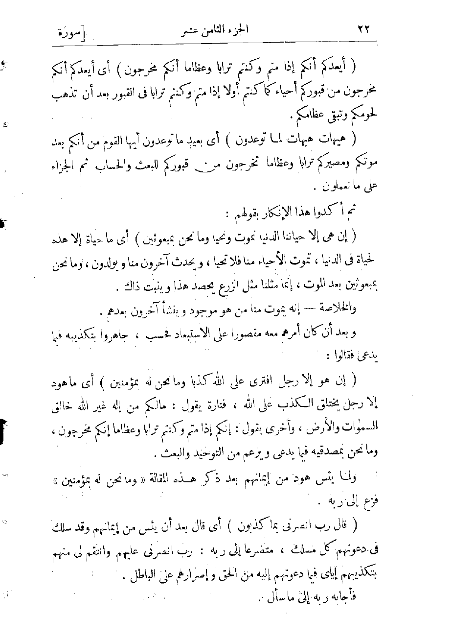 (ثُمَّ أَنْشَأْنا مِنْ بَعْدِهِمْ قَرْناً آخَرِينَ. فَأَرْسَلْنا فِيهِمْ رَسُولًا مِنْهُمْ أَنِ اعْبُدُوا اللَّهَ ما لَكُمْ مِنْ إِلهٍ غَيْرُهُ، أَفَلا تَتَّقُونَ؟) أي ثم أوجدنا من بعد مهلك قوم نوح قوما آخرين وهم عاد، فأرسلنا فيهم رسولا منهم، وهو هود عليه السلام داعيا لهم قائلا: يا قوم اعبدوا الله وأطيعوه دون الأوثان والأصنام، فإن العبادة لا تنبغى إلا له، ولا تصلح لسواه، أفلا تخافون عقابه بعبادتكم غيره من وثن أو صنم؟