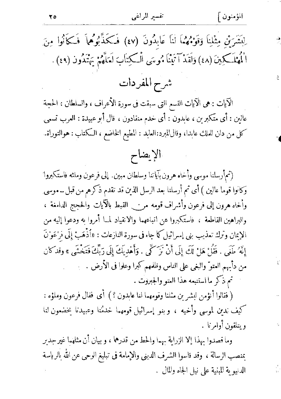 الآيات: هى الآيات التسع التي سبقت فى سورة الأعراف، والسلطان: الحجة عالين: أي متكبرين، عابدون: أي خدم منقادون، قال أبو عبيدة: العرب تسمى كل من دان للملك عابدا، وقال المبرد: العابد: المطيع الخاضع، الكتاب: هو التوراة.