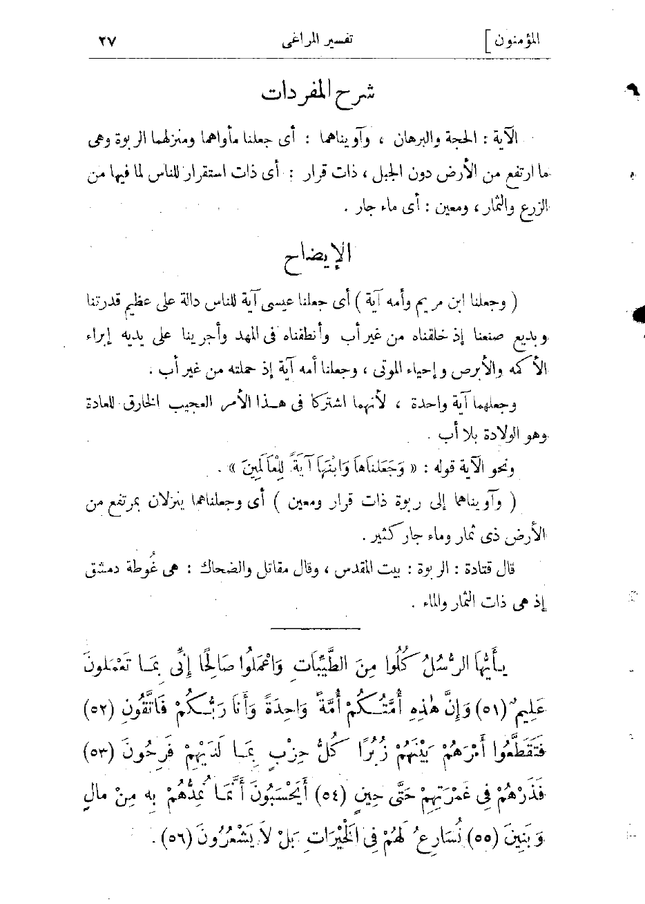 الآية: الحجة والبرهان، وآويناهما: أي جعلنا مأواهما ومنزلهما الربوة: وهى ما ارتفع من الأرض دون الجبل، ذات قرار: أي ذات استقرار للناس لما فيها من الزرع والثمار، ومعين: أي ماء جار.