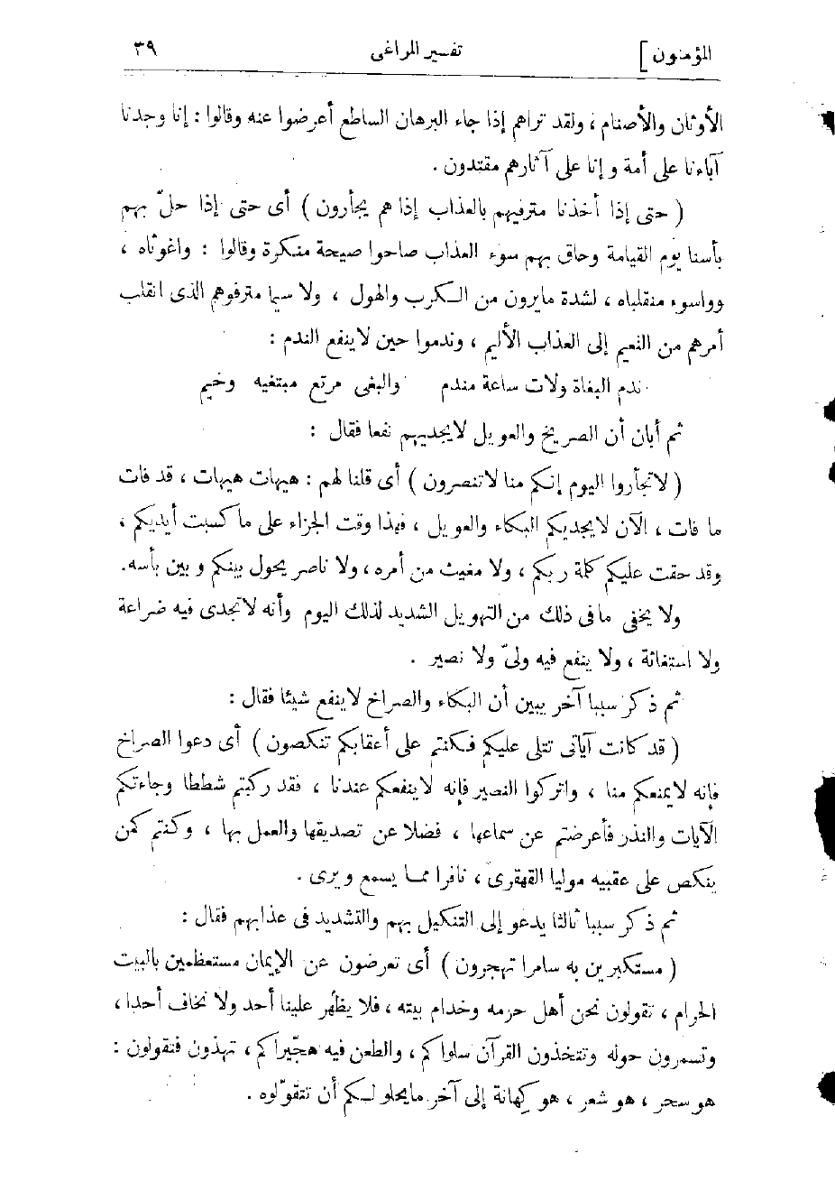 (مُسْتَكْبِرِينَ بِهِ سامِراً تَهْجُرُونَ) أي تعرضون عن الإيمان، مستعظمين بالبيت الحرام، تقولون نحن أهل حرمه وخدّام بيته، فلا يظهر علينا أحد، ولا نخاف أحدا، وتسمرون حوله وتتخذون القرآن سلواكم، والطعن فيه هجّيراكم، تهذون فتقولون: