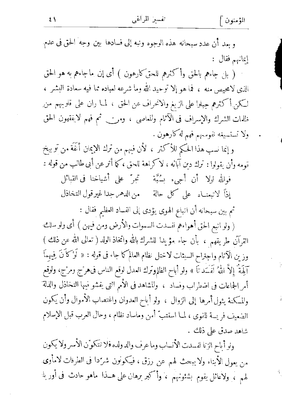 (وَلَوِ اتَّبَعَ الْحَقُّ أَهْواءَهُمْ لَفَسَدَتِ السَّماواتُ وَالْأَرْضُ وَمَنْ فِيهِنَّ) أي ولو سلك القرآن طريقهم، بأن جاء مؤيدا للشرك بالله، واتخاذ الولد، (تعالى الله عن ذلك) وزيّن الآثام واجتراح السيئات، لاختل نظام العالم كما جاء فى قوله: «لَوْ كانَ فِيهِما آلِهَةٌ إِلَّا اللَّهُ لَفَسَدَتا» ولو أباح الظلم وترك العدل لوقع الناس فى هرج ومرج، ولوقع أمر الجماعات فى اضطراب وفساد، والمشاهد فى الأمم التي يفشو فيها التخاذل والذلة والمسكنة يئول أمرها إلى الزوال، ولو أباح العدوان واغتصاب الأموال وأن يكون الضعيف فريسة للقوى، لما استتبّ أمن ولا ساد نظام، وحال العرب قبل الإسلام شاهد صدق على ذلك.