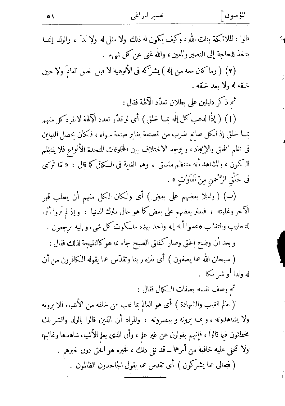 (ب) (وَلَعَلا بَعْضُهُمْ عَلى بَعْضٍ) أي ولكان لكل منهم أن يطلب قهر الآخر وغلبته، فيعلو بعضهم على بعض كما هو حال ملوك الدنيا، وإذا لم تروا أثرا للتحارب والتغالب فاعلموا أنه إله واحد بيده ملكوت كل شىء وإليه ترجعون.