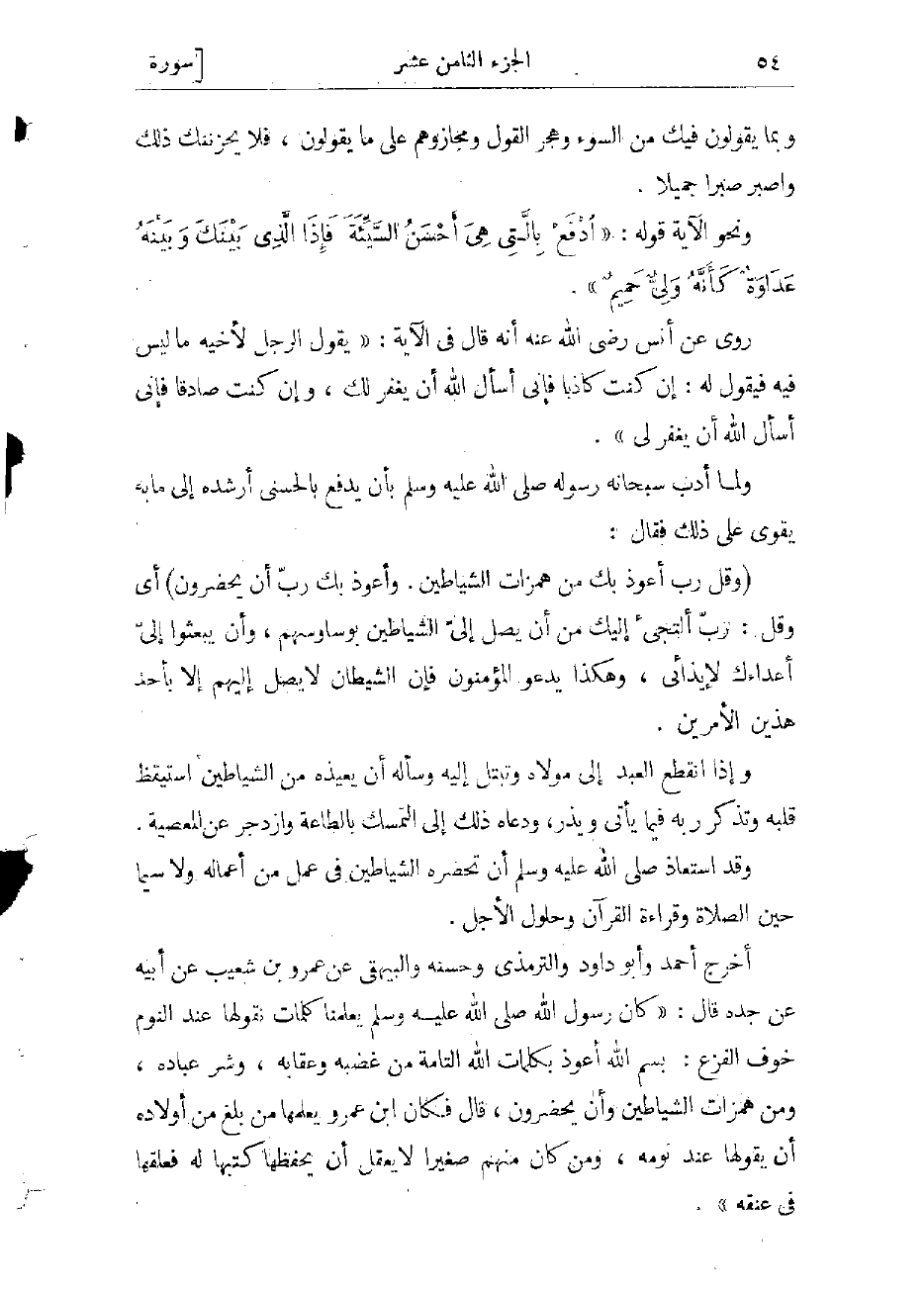 (وَقُلْ رَبِّ أَعُوذُ بِكَ مِنْ هَمَزاتِ الشَّياطِينِ. وَأَعُوذُ بِكَ رَبِّ أَنْ يَحْضُرُونِ) أي وقل: رب إنى ألتجئ إليك من أن يصل إلىّ الشياطين بوساوسهم، أو أن يبعثوا إلىّ أعداءك لإيذائى، وهكذا يدعو المؤمنون فإن الشيطان لا يصل إليهم إلا بأحد هذين الأمرين.