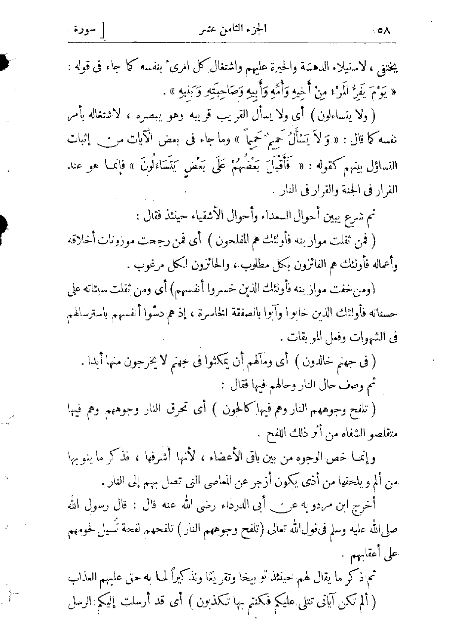 أخرج ابن مردويه عن أبى الدرداء رضى الله عنه قال: قال رسول الله صلى الله عليه وسلّم فى قول الله تعالى (تَلْفَحُ وُجُوهَهُمُ النَّارُ) تلفحهم لفحة تسيل لحومهم على أعقابهم.