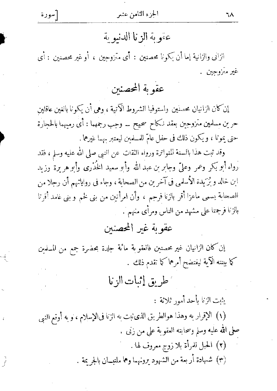 إن كان الزانيان محصنين واستوفيا الشروط الآتية، وهى أن يكونا بالغين عاقلين حرين مسلمين متزوجين بعقد نكاح صحيح- وجب رجمهما: أي رميهما بالحجارة حتى يموتا، ويكون ذلك فى حفل عامّ للمسلمين ليعتبر بهما غيرهما.