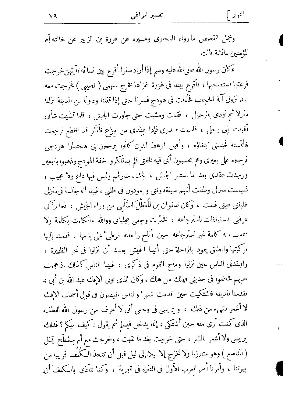 رواه البخاري وغيره عن عروة بن الزبير عن خالته أم المؤمنين عائشة قالت: «كان رسول الله صلّى الله عليه وسلّم إذا أراد سفرا أقرع بين نسائه فأيتهن حرجت قرعتها استصحبها، فأقرع بيننا فى غزوة غزاها فخرج سهمى (نصيبى) فخرجت معه بعد نزول آية الحجاب فحملت فى هودج فسرنا حتى إذا قفلنا ودنونا من المدينة نزلنا منزلا ثم نودى بالرحيل، فقمت ومشيت حتى جاوزت الجيش، فلما قضيت شأنى أقبلت إلى رحلى، فلست صدرى فإذا عقدى من جزع ظفار قد انقطع، فرجعت فالتمسته فحبسنى ابتغاؤه، وأقبل الرّهط الذين كانوا يرحّلون بي فاحتملوا هودجى فرحّلوه على بعيري وهم يحسبون أنى فيه لخفتى، فلم يستنكروا خفة الهودج وذهبوا بالبعير، ووجدت عقدى بعد ما استمر الجيش، فجئت منازلهم وليس فيها داع ولا مجيب، فتيممت منزلى وظننت أنهم سيفقدوننى ويعودون فى طلبى، فبينا أنا جالسة فى منزلى غلبتنى عينى فنمت، وكان صفوان بن المعطّل السّلمى من وراء الجيش، فلما رآنى عرفنى فاستيقظت باسترجاعه، فخمّرت وجهى بجلبابي، وو الله ما تكلمت بكلمة ولا سمعت منه كلمة غير استرجاعه حين أناخ راحلته فوطئ على يديها، فقمت إليها فركبتها وانطلق يقود بالراحلة حتى أتينا الجيش بعد أن نزلوا فى نحر الظهيرة، وافتقدنى الناس حين نزلوا وماج القوم فى ذكرى، فبينا الناس كذلك إذ هجمت عليهم فخاضوا فى حديثى فهلك من هلك، وكان الذي تولى الإفك عبد الله بن أبى، فقدمنا المدينة فاشتكيت حين قدمت شهرا والناس يفيضون فى قول أصحاب الإفك لا أشعر بشىء من ذلك، ويريبنى فى وجعي أنى لا أعرف من رسول الله اللطف الذي كنت أرى منه حين أشتكى، إنما يدخل فيسلم ثم يقول: كيف تيكم؟ فذلك يريبنى ولا أشعر بالشر، حتى خرجت بعد ما نقهت، وخرجت مع أم مسطح قبل (المناصع) وهو متبرّزنا ولا نخرج إلا ليلا إلى ليل قبل أن تتخذ الكنف قريبا من بيوتنا، وأمرنا أمر العرب الأول فى التنزه فى البرية، وكنا نتأذى بالكنف أن نتخذها عند بيوتنا، فانطلقت أنا وأم مسطح