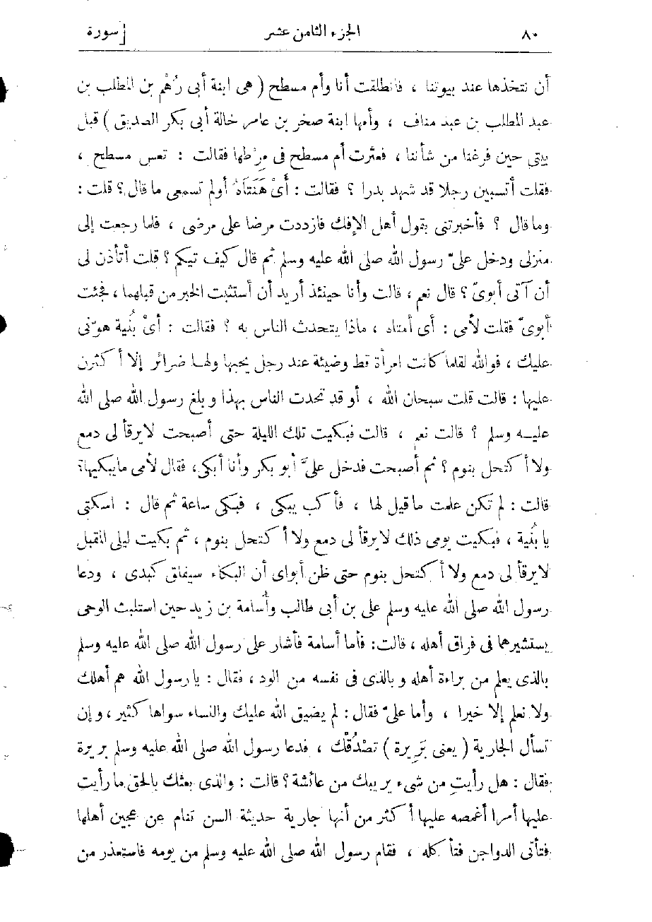 قلت أتأذن لى أن آتى أبوىّ؟ قال نعم، قالت وأنا حينئذ أريد أن أستثبت الخبر من قبلهما، فجئت أبوىّ فقلت لأمى: أي أماه، ماذا يتحدث الناس به؟ فقالت: أي بنيّة هوّنى عليك، فو الله لقلما كانت امرأة قط وضيئة عند رجل يحبها ولها ضراتر إلا أكثرن عليها: قالت قلت سبحان الله، أو قد تحدث الناس بهذا وبلغ رسول الله صلّى الله عليه وسلّم؟ قالت نعم، قالت فبكيت تلك الليلة حتى أصبحت لا يرقألى دمع ولا أكتحل بنوم؟ ثم أصبحت فدخل علىّ أبو بكر وأنا أبكى، فقال لأمى ما يبكيها؟