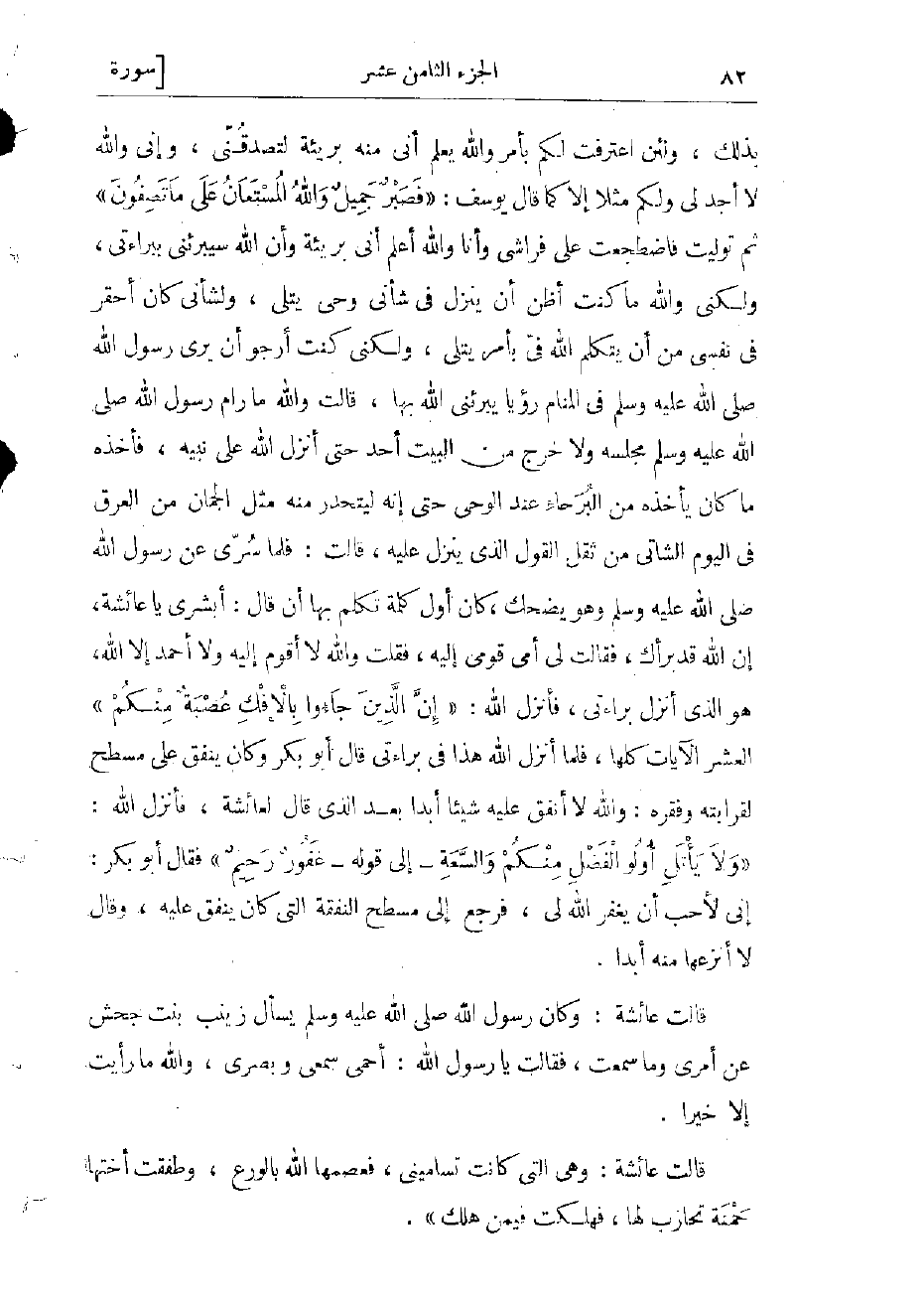 فإن قلت لكم إنى بريئة (والله يعلم أبى بريئة) لا تصدّقونى بذلك، ولئن اعترفت لكم بأمر والله يعلم أنى منه بريئة لتصدّقنى، وإنى والله لا أجد لى ولكم مثلا إلا كما قال أبو يوسف «فَصَبْرٌ جَمِيلٌ وَاللَّهُ الْمُسْتَعانُ عَلى ما تَصِفُونَ» ثم توليت فاضطجعت على فراشى وأنا والله أعلم أنى بريئة، وأن الله سيبرئنى ببراءتي، ولكنى والله ما كنت أظن أن ينزل فى شأنى وحي يتلى، ولشأنى كان أحقر فى نفسى من أن يتكلم الله فى بأمر يتلى، ولكنى كنت أرجو أن يرى رسول الله صلّى الله عليه وسلّم فى المنام رؤيا يبرئنى الله بها، قالت والله ما دام رسول الله صلّى الله عليه وسلّم مجلسه ولا خرج من البيت أحد حتى أنزل الله على نبيه، فأخذه ما كان يأخذه من البرحاء عند الوحى حتى إنه ليتحدّر منه مثل الجمان