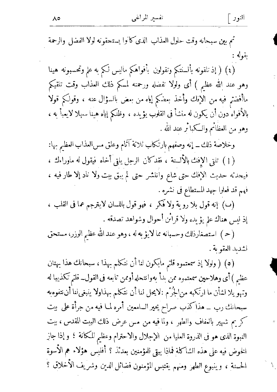 (هـ) (وَلَوْلا إِذْ سَمِعْتُمُوهُ قُلْتُمْ ما يَكُونُ لَنا أَنْ نَتَكَلَّمَ بِهذا، سُبْحانَكَ هذا بُهْتانٌ عَظِيمٌ) أي وهلّا حين سمعتموه ممن بدأ به وانتحله أو ممن تابعه فى القول- قلتم تكذيبا له وتهويلا لشأن ما ارتكبه من الجرم: لا يحل لنا أن نتكلم بهذا ولا ينبغى لنا أن نتفوه به سبحانك رب- هذا كذب صراح يحيّر السامعين، أمره، لما فيه من جرأة على بيت كريم شهير بالعفاف والطهر، ولما فيه من مس عرض ذلك البيت المقدس، بيت النبوة الذي هو فى الذروة العليا من الإجلال والاحترام وعظيم المكانة، وإذا جاز الخوض فيه على هذه الشاكلة فماذا يبقى للمؤمنين بعدئذ؟ أفليس هؤلاء هم الأسوة الحسنة، وينبوع الطهر، ومنهم يقتبس المؤمنون فضائل الدين، وشريف الأخلاق؟ وإنا لنبرأ إليك