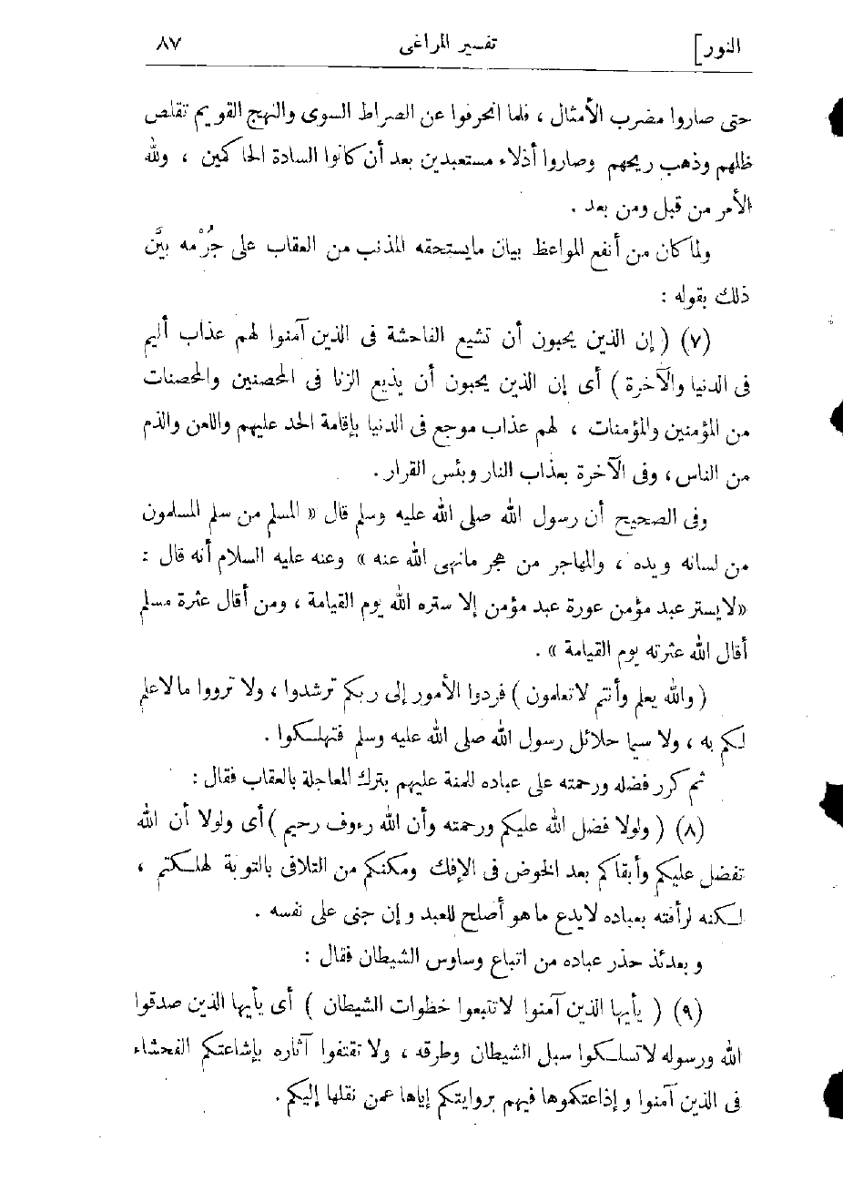 (9) (يا أَيُّهَا الَّذِينَ آمَنُوا لا تَتَّبِعُوا خُطُواتِ الشَّيْطانِ) أي يا أيها الذين صدقوا الله ورسوله لا تسلكوا سبل الشيطان وطرقه، ولا تقتفوا آثاره، بإشاعتكم الفحشاء فى الذين آمنوا، وإذا عتكموها فيهم، بروايتكم إياها عمن نقلها إليكم.