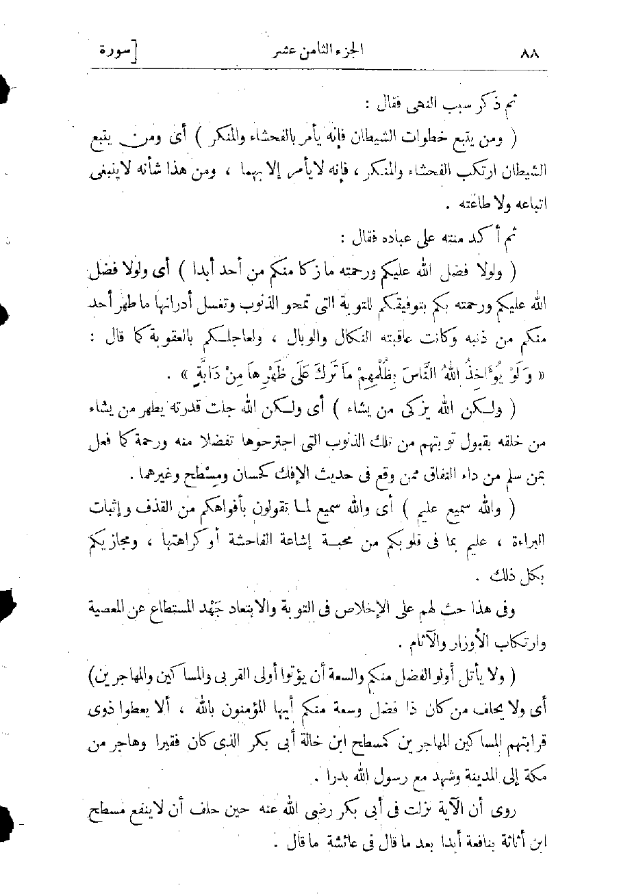 (وَلَوْلا فَضْلُ اللَّهِ عَلَيْكُمْ وَرَحْمَتُهُ ما زَكى مِنْكُمْ مِنْ أَحَدٍ أَبَداً) أي ولولا فضل الله عليكم ورحمته بكم بتوفيقكم للتوبة التي تمحو الذنوب وتغسل أدرانها ما طهر أحد منكم من ذنبه وكانت عاقبته النكال والوبال، ولعاجلكم بالعقوبة كما قال: