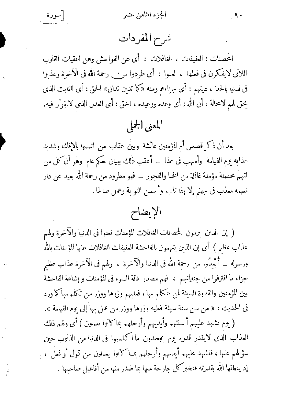 (إِنَّ الَّذِينَ يَرْمُونَ الْمُحْصَناتِ الْغافِلاتِ الْمُؤْمِناتِ لُعِنُوا فِي الدُّنْيا وَالْآخِرَةِ وَلَهُمْ عَذابٌ عَظِيمٌ) أي إن الذين يتهمون بالفاحشة العفيفات الغافلات عنها المؤمنات بالله ورسوله- يبعدون من رحمة الله فى الدنيا والآخرة، ولهم فى الآخرة عذاب عظيم جزاء ما اقترفوا من جناياتهم، فهم مصدر قالة السوء فى المؤمنات، وإشاعة الفاحشة بين المؤمنين والقدوة السيئة لمن يتكلم بها، فعليهم وزرها ووزر من تكلم بها كما ورد فى الحديث:
