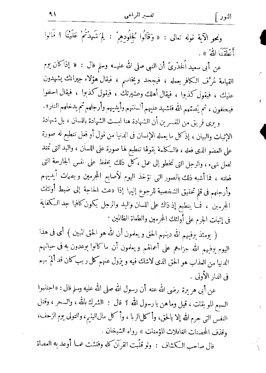 ويرى فريق من المفسرين أن الشهادة هنا ليست الشهادة باللسان، بل شهادة الإثبات والبيان، إذ كل ما يعمله الإنسان فى الدنيا من قول أو فعل تنطبع له صورة على العضو الذي فعله، فالكلمة يقولها تنطبع لها صورة على اللسان، واليد التي تمتد لفعل شىء، والرجل التي تخطو إلى عمل، كل ذلك يحفظ على نفس الجارحة التي فعلته، فما أشبه ذلك بالصور التي تؤخذ اليوم لأصابع المجرمين وبصمات أيديهم وأرجلهم فى قلم تحقيق الشخصية للرجوع إليها إذا دعت الحاجة إلى ضبط أولئك المجرمين، فما ينطبع إذ ذاك على اللسان واليد والرجل يكون كافيا جد الكفاية فى إثبات الجرم على أولئك المجرمين والطغاة الظالمين.