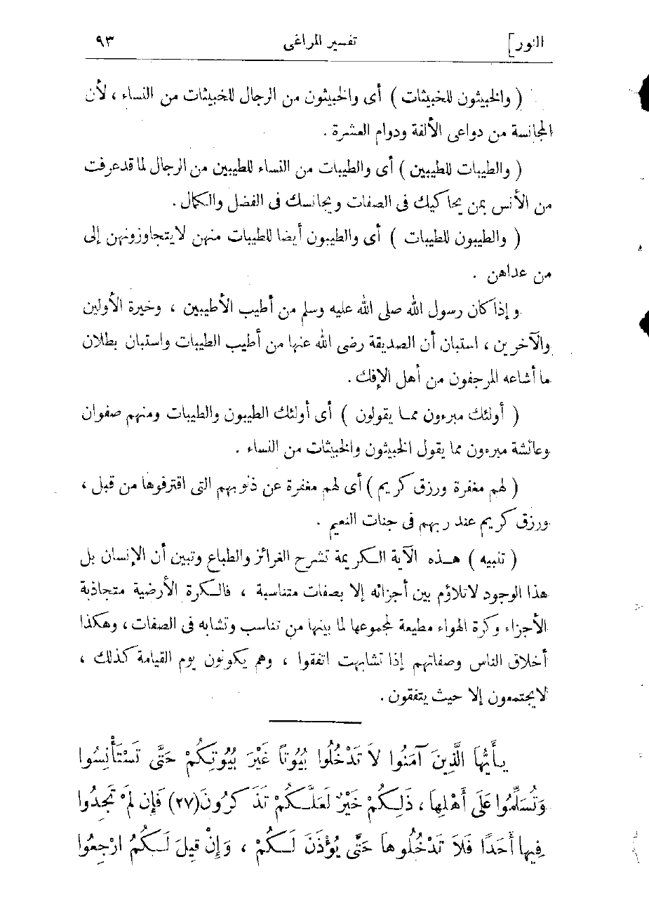 (وَالطَّيِّباتُ لِلطَّيِّبِينَ) أي والطيبات من النساء للطيبين من الرجال، لما قد عرفت من الأنس بمن يحاكيك فى الصفات، ويجانسك فى الفضل والكمال.