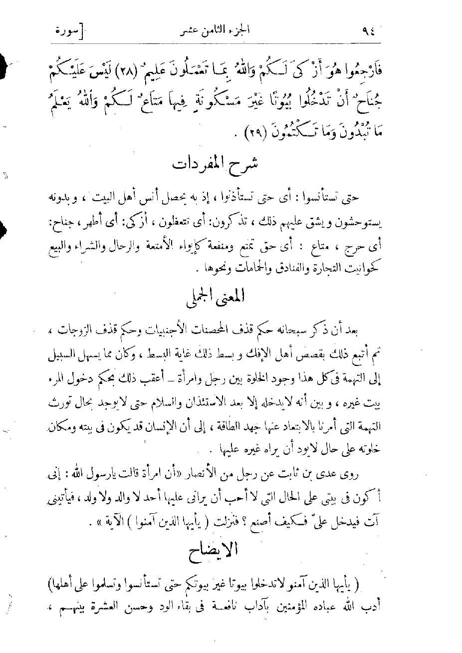 حتى تستأنسوا: أي حتى تستأذنوا، إذ بالاستئذان يحصل أنس أهل البيت، وبدونه يستوحشون ويشق عليهم الدخول، تذكرون: أي تتعظون، أزكى: أي أطهر، جناح: أي حرج، متاع: أي حق تمتع ومنفعة كإيواء الأمتعة والرحال والشراء والبيع، كحوانيت التجارة والفنادق والحمامات ونحوها.