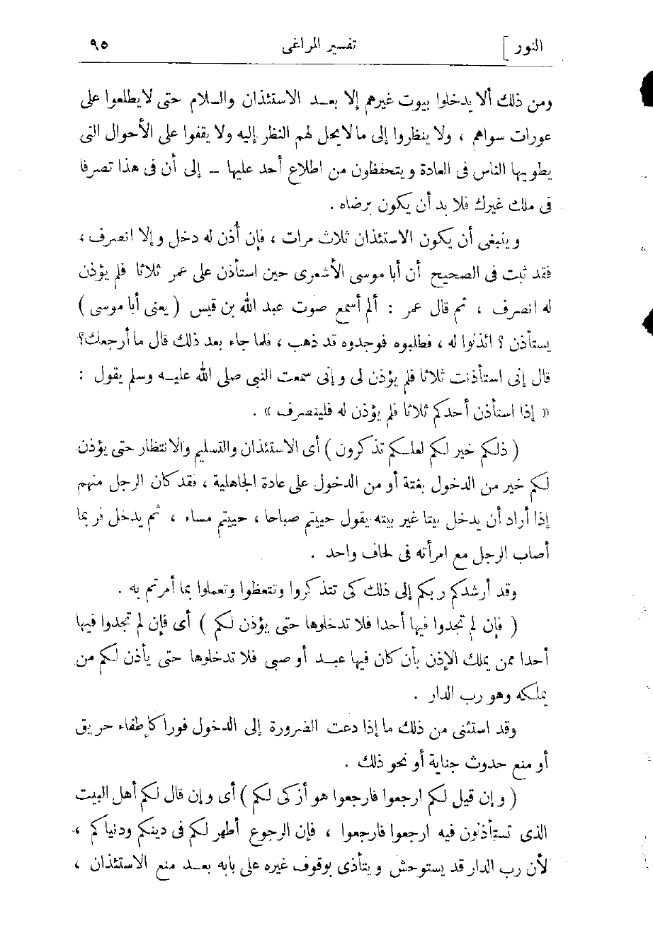 ألا يدخلوا بيوت غيرهم إلا بعد الاستئذان والسلام حتى لا يطلعوا على عورات سواهم، ولا ينظروا إلى ما لا يحل لهم النظر إليه، ولا يقفوا على الأحوال التي يطويها الناس فى العادة، ويتحفظون من اطلاع أحد عليها إلى أن فى هذا تصرفا فى ملك غيرك فلابد أن يكون برضاه.