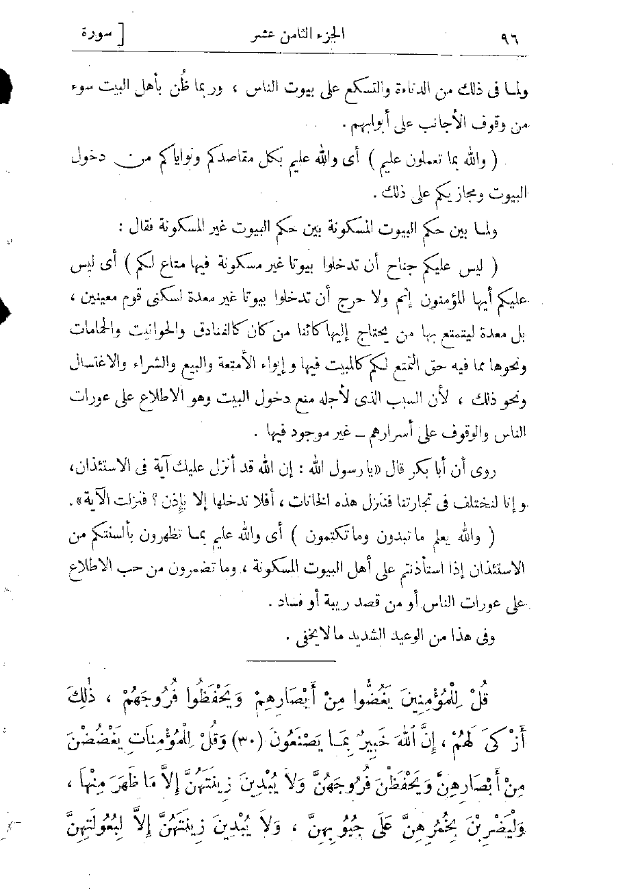 روى أن أبا بكر قال «يا رسول الله، إن الله قد أنزل عليك آية فى الاستئذان، وإنا لنختلف فى تجارتنا فننزل هذه الخانات، أفلا ندخلها إلا بإذن؟ فنزلت الآية» .