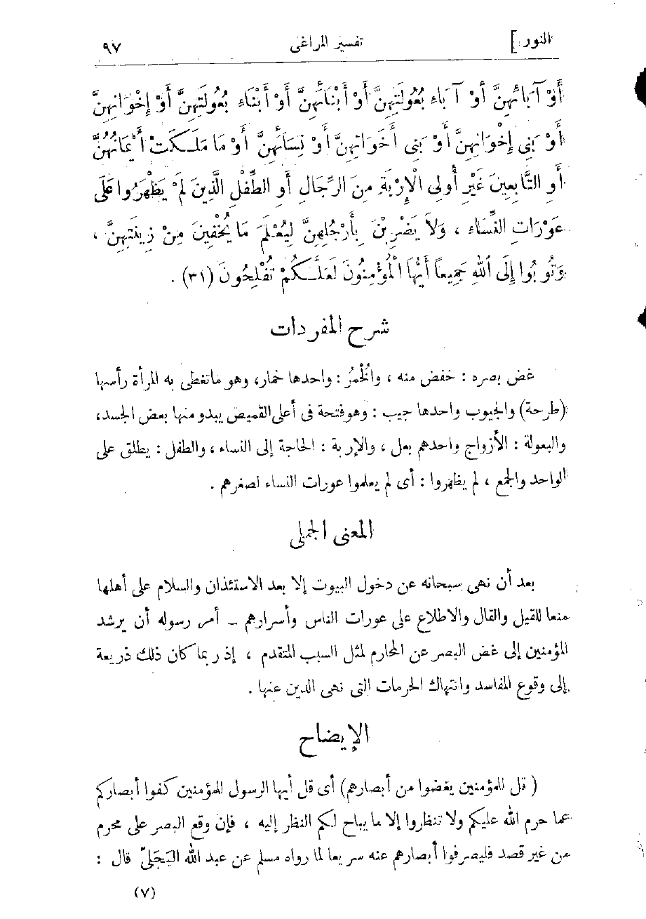 غض بصره: خفّض منه، والخمر: واحدها خمار وهو ما تغطى به المرأة رأسها (طرحة) والجيوب واحدها جيب: وهو فتحة فى أعلى القميص يبدو منها بعض الجسد، والبعولة: الأزواج واحدهم بعل، والإربة: الحاجة إلى النساء، والطفل: يطلق على الواحد والجمع، لم يظهروا: أي لم يعلموا عورات النساء لصغرهم.