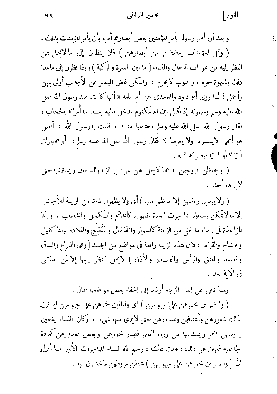 (وَلْيَضْرِبْنَ بِخُمُرِهِنَّ عَلى جُيُوبِهِنَّ) أي وليلقين خمرهن على جيوبهن ليسترن بذلك شعورهن وأعناقهن وصدورهن حتى لا يرى منها شىء، وكان النساء يغطين رءوسهن بالخمر ويسدلها من وراء الظهر فتبدو نحورهن وبعض صدورهن كعادة الجاهلية فنهين عن ذلك، قالت عائشة: رحم الله النساء المهاجرات الأول لما أنزل الله (وَلْيَضْرِبْنَ بِخُمُرِهِنَّ عَلى جُيُوبِهِنَّ) شققن مروطهن فاختمرن بها.